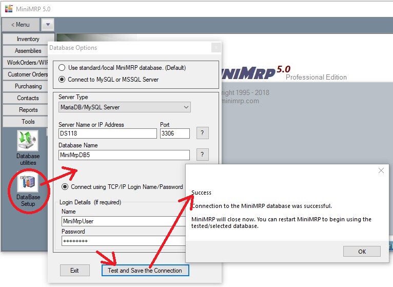At the very top of the setup window select the option "Connect to MySQL or MSSQL Server" Next is 'Server Type'. MiniMrp can connect to Microsoft SQL Server or MariaDB/MySQL Servers. Change the 'Server Type' to 'MariaDB/MySql Server'. Fill in the remaining options for Server Name, Database Name, User Name and Password. In our example the Synology NAS device is on our local network and is reachable using just the device name "DS118". In your case, depending on your NAS device, you may need to use the device's IP address instead. Click the 'Test and Save' button. If you've set everything up correctly you'll see the 'Success' message. If you see an error message instead then check your settings and try again. If necessary go back to Server Setup Remember, with MariaDB and MySQL user names etc. can be case sensitive so make sure your connection details are correct. Once setup correctly the setup window will close and you can restart MiniMRP. Click the "About" button to confirm you've connected to your NAS device.
