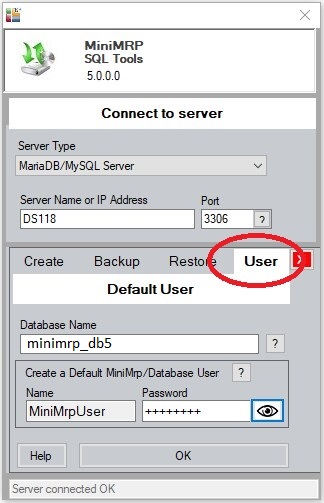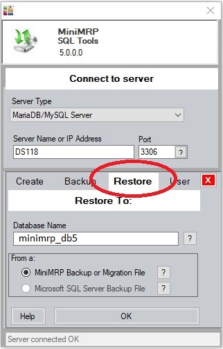 Select: Server Type "MariaDB/MySQL Server" and other options as shown above. In our example we're testing with a Synology DS118 device and we're able to enter just the device name 'DS118' and the default port number '3306'. Depending on your device and network setup you may need to enter the IP address or a different port number for the NAS device instead. Enter the User Name and Password and click the button to "Test the Server Connection". If all was setup correctly you should get a "Connected" notification and the display changes to offer more options. "Create, Backup, Restore and User" tabs across the middle of the window as shown in the picture below. Restoring from a backup or previous version of MiniMRP. If you are migrating from a previous version of MiniMRP or migrating from a standard/non-sql database to a professional edition on MariaDB/MySQL then select the "Restore" option.