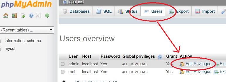 Select the "User accounts" tab and click the admin user's "Edit privileges".
