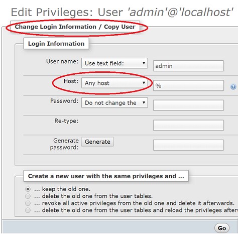 Note: Newer versions of phpMyAdmin might not have the long page layout. Instead they have a modern tabbed display with fewer options on each tab. In that case select the "Login Information" tab and that should get you directly to the same window as shown below.